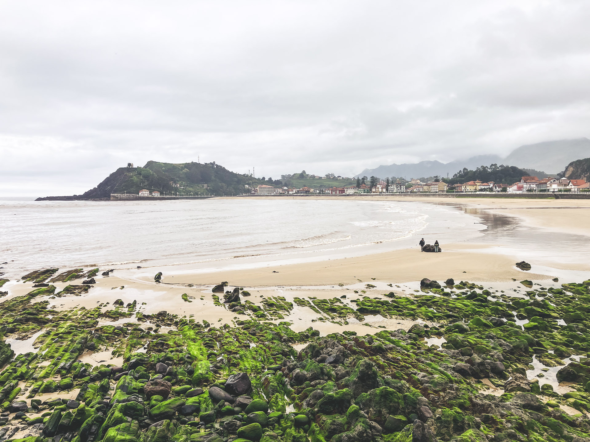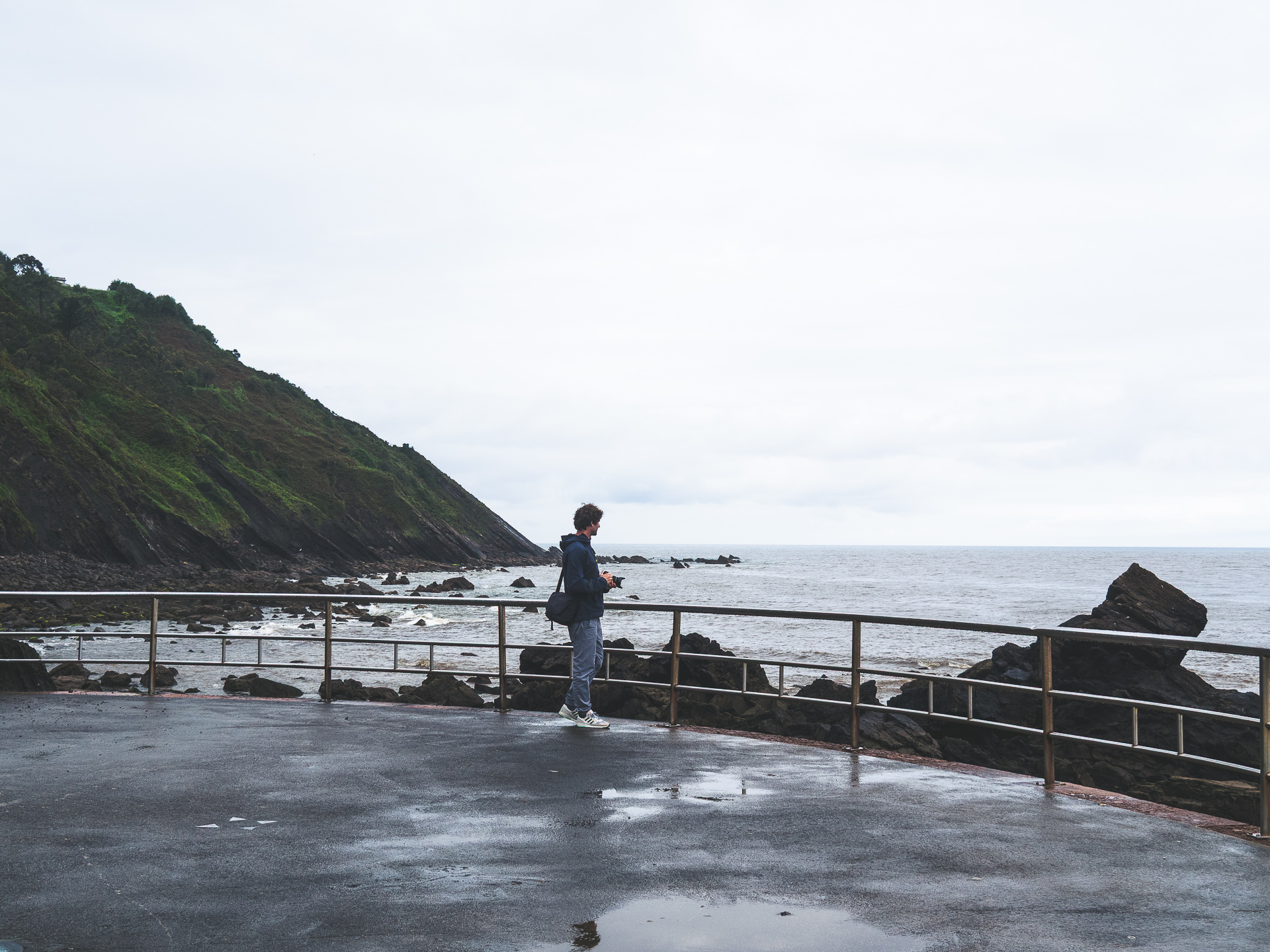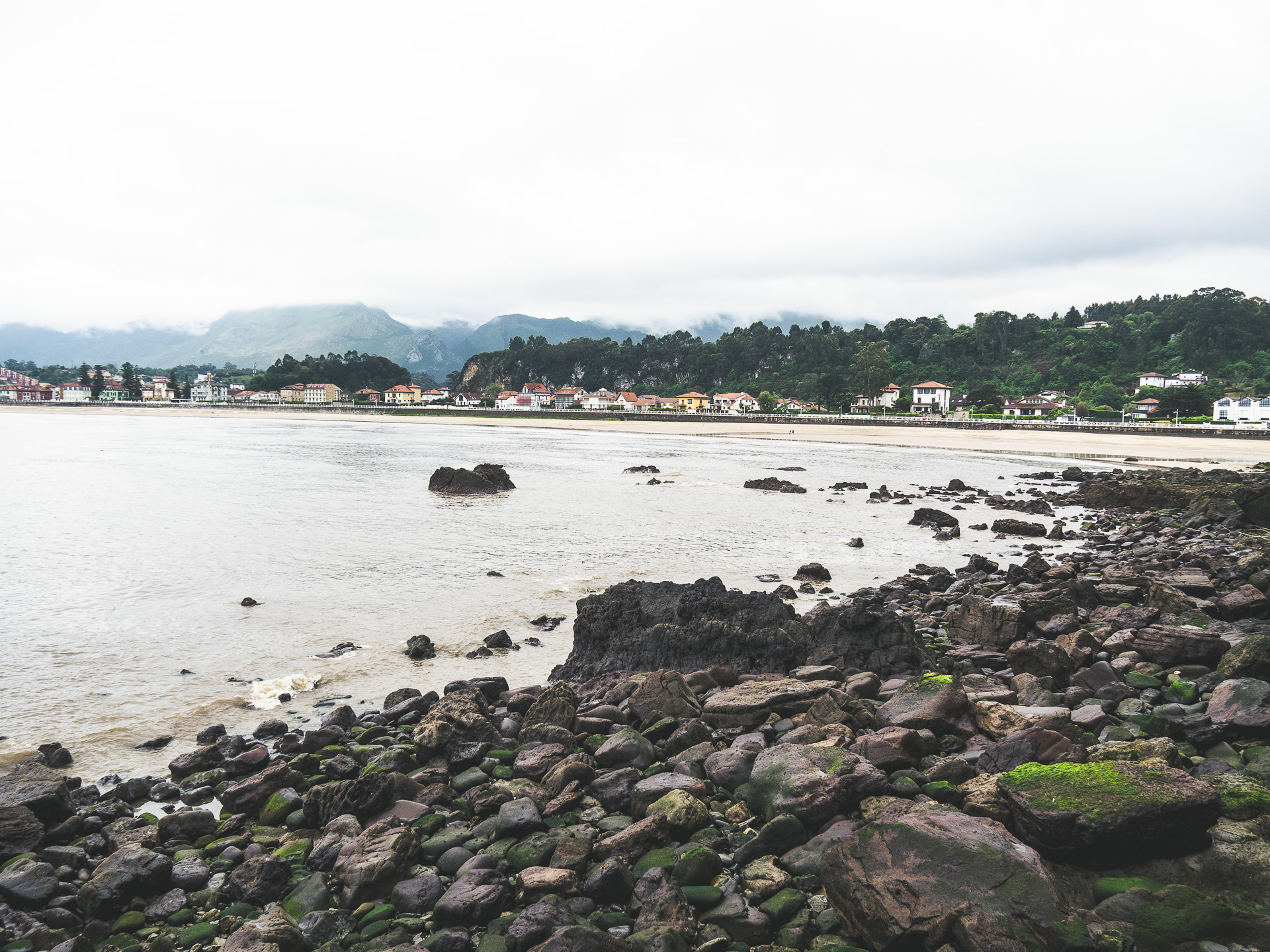 Als wir ankommen, ist der Himmel grau und das Wasser leicht bräunlich. Es gibt zum Glück eh keine Wellen, aber selbst wenn, weiß ich nicht, ob ich da hätte reingehen wollen. Da wir aber schon mal hier sind, schnappen wir uns zumindest die Kameras und laufen ein bisschen auf der Strandmauer entlang zum Mirador Punta del Pozu. Immerhin finden wir Mr. Crabs und seine Gang und einen schönen Ausblick hat man auch.