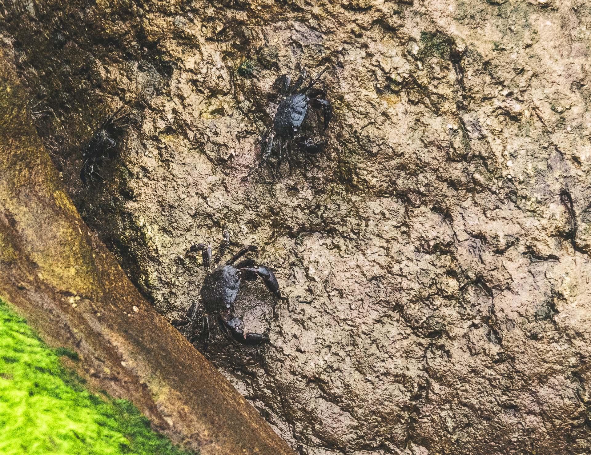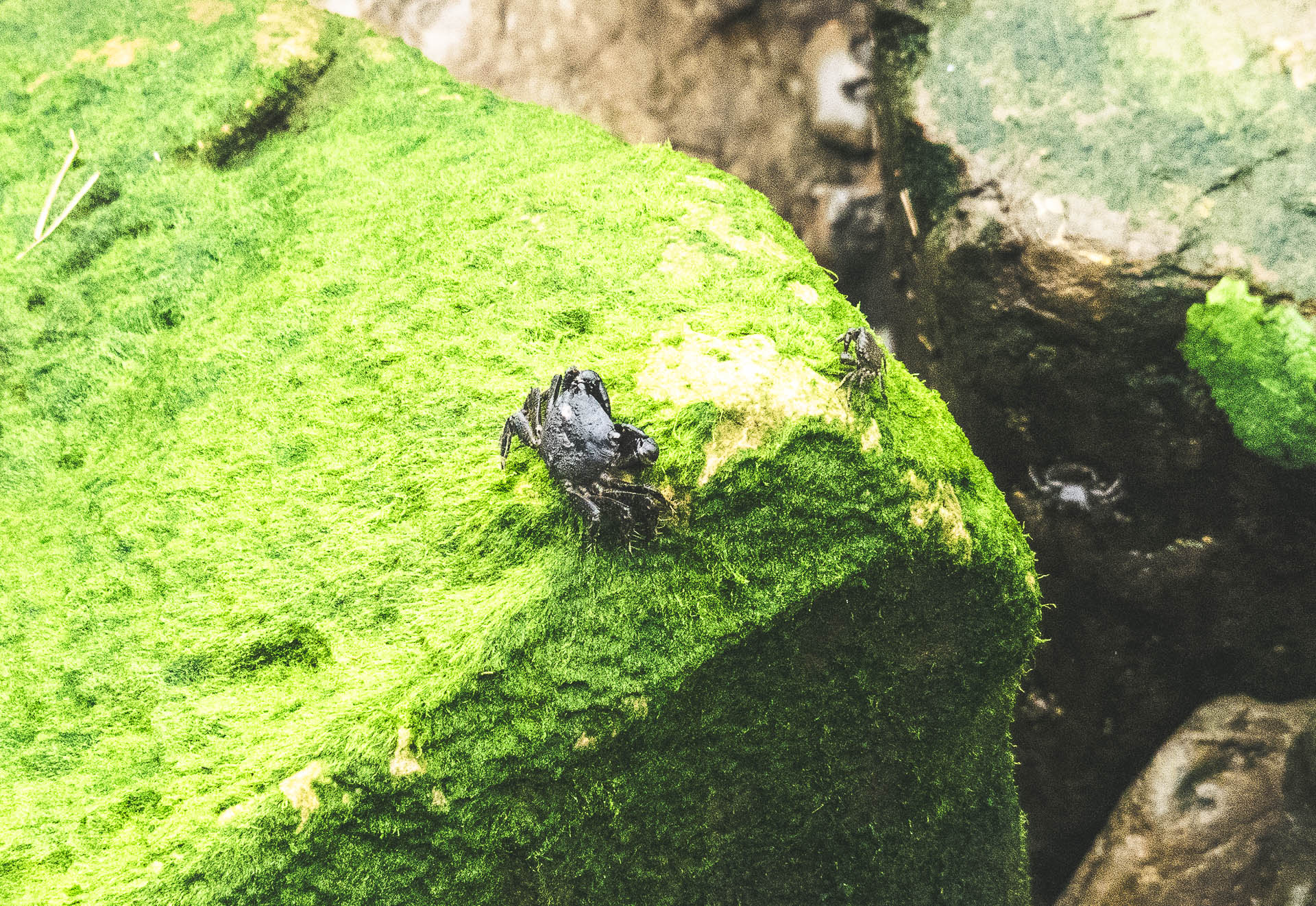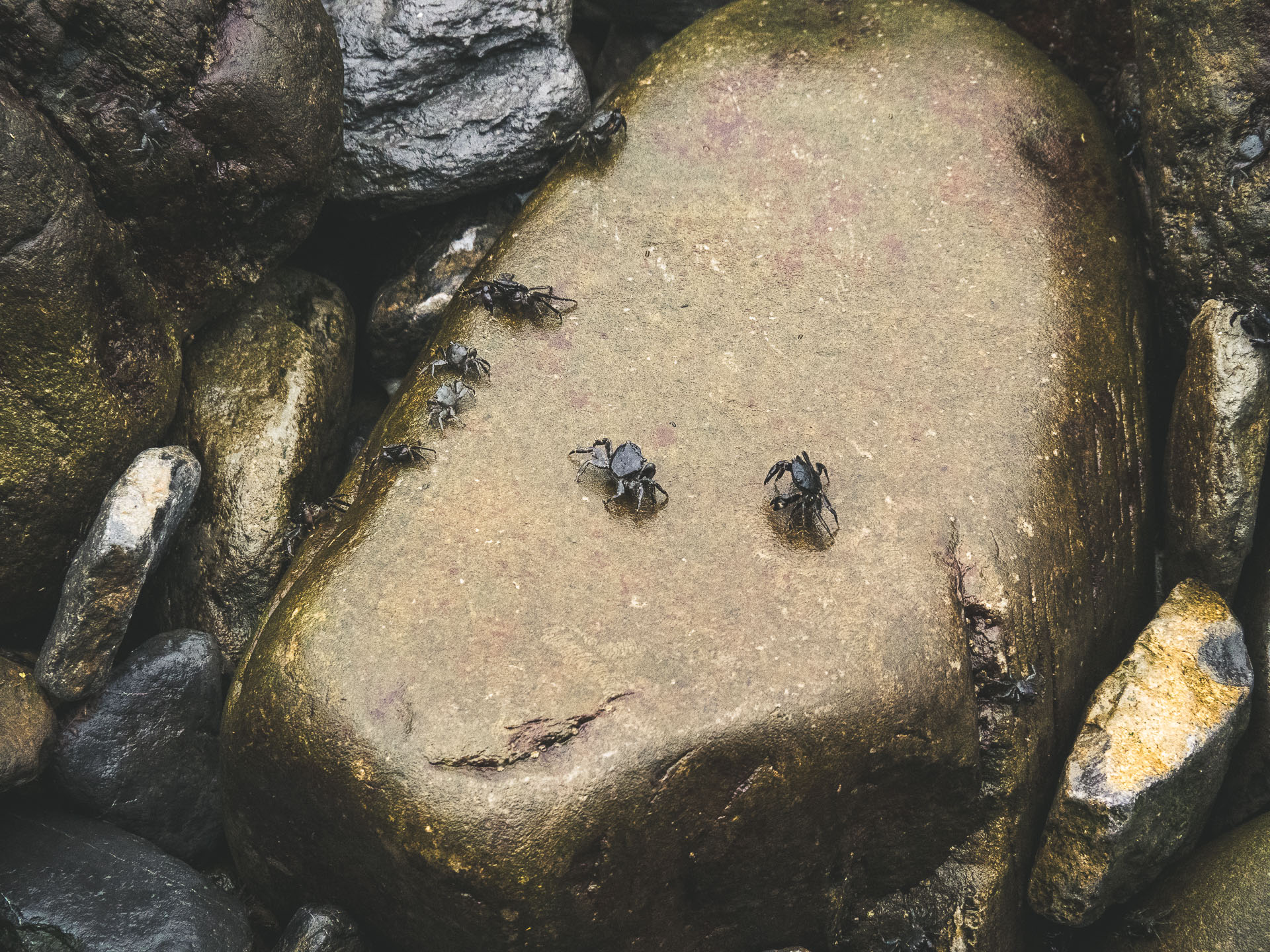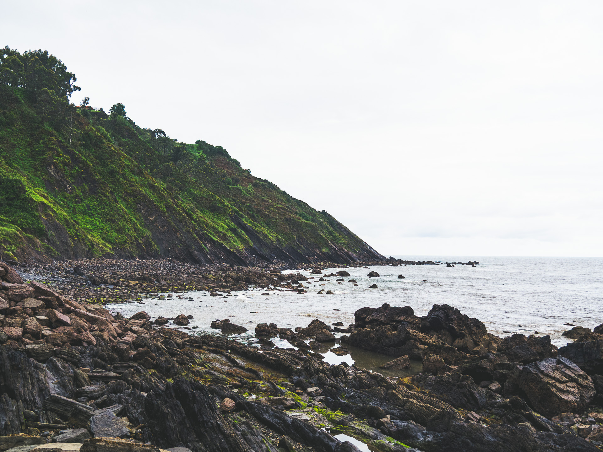 Als wir ankommen, ist der Himmel grau und das Wasser leicht bräunlich. Es gibt zum Glück eh keine Wellen, aber selbst wenn, weiß ich nicht, ob ich da hätte reingehen wollen. Da wir aber schon mal hier sind, schnappen wir uns zumindest die Kameras und laufen ein bisschen auf der Strandmauer entlang zum Mirador Punta del Pozu. Immerhin finden wir Mr. Crabs und seine Gang und einen schönen Ausblick hat man auch.